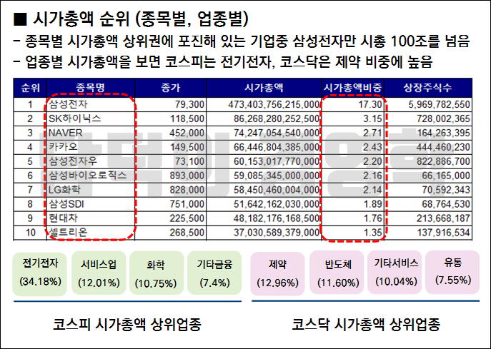 누구나 한번쯤은 사봤을 삼성전자를 예로 들면 현재 시가총액은 408조 3331억원임을 알 수 있다. 오늘 기준 주당 68,400원에 거래되고 있으며, 상장주식수는 5,969,782,550주입니다. 그 숫자를 곱하면 앞서 말한 대로 408조가 된다. 여기서 한 가지 알아두셔야 할 점은 당일 판매가와는 상관없이 손실이 발생한다는 점입니다. 발행주식 수가 많을수록 시가총액도 높아집니다. 삼성SDI는 주당 47만4000원에 거래되고 있지만 시가총액은 32조원으로 삼성전자의 10분의 1에도 미치지 못한다. 그렇기 때문에 주당 가격도 중요하지만, 발행된 물량이 얼마나 되는지도 확인해야 합니다. 코스피 순위 주식을 거래할 때 얼마나 안전한지, 높은 수준의 수익을 가져올 수 있는지를 기대하고 주식을 선택한다면 당연히 우량주를 선택하는 것이 좋습니다. 이미 지금까지의 엄청난 발전을 통해 자리잡은 기업들입니다. 아주 큰 리스크가 있지 않는 한 꾸준하게 상승할 수 있기 때문이다. 검색창에 코스피 시가총액을 입력하시면 순위가 나옵니다. 앞서 보셨던 삼성전자가 1위를 기록하고 있으며, 현재 화면에서는 최대 10위까지 확인하실 수 있습니다. 오른쪽의 데이터도 확인해 주세요. 하단의 상위주 더보기를 클릭하시면 한 번쯤 들어보셨을 만한 기업들이 나타나며, 해당 기업의 순위를 보실 수 있습니다. 코스닥 순위에는 흔히 말하는 중소기업이 대거 포함되며, 수조원대 기업도 포함된다. 코스닥시장은 향후 성장 가능성이 높지만 초대형 우량주에 비해 발전 가능성이 훨씬 더 높은 것으로 보인다. . 마찬가지로 코스닥에 들어오시면 상위 10위까지 나열되어 있으며, 더 자세히 알고 싶으시면 더보기를 눌러주시면 됩니다. 여기에도 최근 이슈가 되고 있는 여러 기업이 나열돼 있는데, 에코프로/셀트리온/포스코가 상위권에 랭크됐다. . 지표로 활용 주식을 단순하게 생각하면 매수자가 많으면 가격이 오르고, 매도자가 많으면 가격이 하락합니다. 시가총액이 높은 이유는 많은 분들이 말그대로 선택하시고, 미래가치를 염두에 두고 보유하고 계시기 때문입니다. , 큰 매물이 없어 가격을 유지하고 있는 것을 알 수 있다. 하지만 무조건 상위 종목만 선택해야 한다는 뜻은 아니다. 눈으로 볼 수 있도록 지표로 제작되었으니 참고용으로 활용하시면 좋을 것 같습니다.